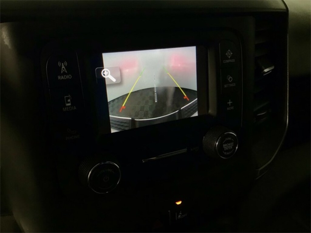 - Clean One-Owner CARFAX! Commanding heavy-duty four-wheel-drive prowess begins with an integrated trailer brake controller â a true game-changer for confident towing control â paired seamlessly with the proven 6.4L HEMI V8 and smooth 8-speed automatic transmission bolstered by an anti-spin differential rear axle manual shift-on-the-fly transfer case with skid-plate protection 220-amp alternator and cold-start-ready engine block heater. Advanced driver confidence flows from the comprehensive Safety Group delivering full-speed forward-collision warning plus with automatic emergency braking adaptive cruise control with stop lane-keep assist rain-sensing wipers automatic high beams blind-spot monitoring with trailer detection and rear cross-path detection power heated trailer-tow mirrors with turn signals and courtesy lamps adaptive steering system leather-wrapped steering wheel with audio controls and a crisp 7.0-inch color driver display plus digital rearview mirror. The upgraded Tradesman cabin welcomes with carpeted flooring and front/rear mats durable cloth 40/20/40 bench seating rear power-sliding window SiriusXM satellite radio LED bed lighting rear wheelhouse liners and handy instrument-panel auxiliary switches while the Chrome Appearance Group adds bright front and rear bumpers chrome grille surround striking chrome-clad steel wheels and clearance lamps â all finished in crisp Bright White Clear-Coat over a rugged Black interior.