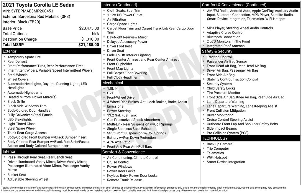 2021 Toyota Corolla LE Sedan I4 DOHC 16V